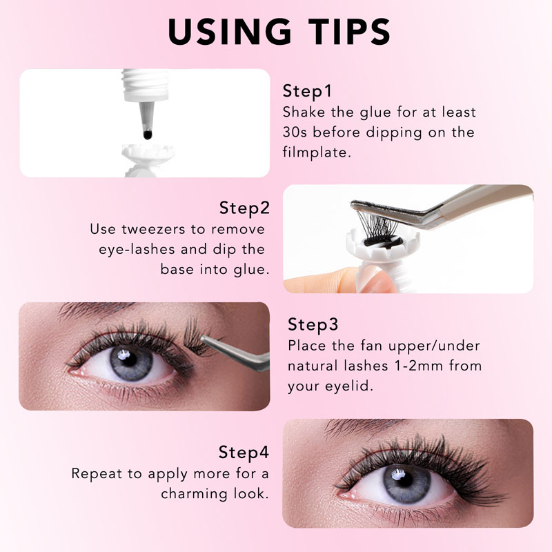 O processo de aplicação é rápido e fácil. Comece selecionando os agrupamentos de cílios desejados e colocando -os em uma superfície plana. Em seguida, aplique uma pequena quantidade da nossa cola de cluster de cílios DIY na base de cada cluster. Deixe a cola de agrupamento de cílios DIY seque por alguns segundos e depois pressione delicadamente os aglomerados nos cílios naturais.